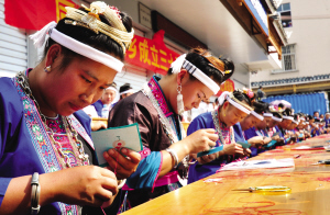 三江縣同樂苗族鄉(xiāng)舉辦刺繡手工限時賽,繡娘們向游客們展示傳統的少數民族刺繡技藝