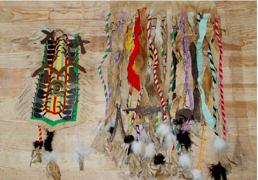 腰裙下擺的前后配戴著50個(gè)銅鈴,以此代表眾多神靈的福音。腰裙上還系著一對(duì)熊神和一對(duì)狼神偶體,因?yàn)槎鯗乜巳苏J(rèn)為熊是人類(lèi)的祖先,人們不能輕易傷害獵取,如果一旦打死熊,也要對(duì)熊骨進(jìn)行風(fēng)葬。而狼據(jù)說(shuō)是神靈的兒子。這些又都可見(jiàn)薩滿(mǎn)信仰又與鄂溫克人在原始社會(huì)條件下的自然崇拜、祖先崇拜有著非常緊密的淵源關(guān)系。