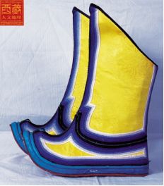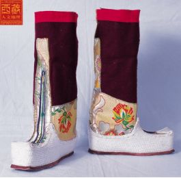 一般藏族男女通行的長筒靴,底高2厘米,腰高至小腿之上,用鞋帶系幫。從大的方面講,藏鞋可分為四種,即“松巴拉姆”、“嘎洛”鞋、靴子和“嘉慶”等,還有單層底、多層底等不同的鞋種,用氌氆、毛呢、皮革、氈子、綢緞、麻布等做料子?!八砂屠贰庇址Q松巴鞋,根據(jù)不同的地區(qū),松巴鞋還可分為藏松巴、江孜松巴、拉薩松巴等, 以花紋秀麗繁雜著稱。嘎洛鞋的特點是美觀、結(jié)實,分為兩種:工布地區(qū)的嘎洛,鞋腰多為牛皮底,上面勾出狗鼻紋;在墨竹工卡、彭波等地流行的嘎洛鞋則一般不用皮料作底,鞋面圖案大方、素雅。靴子大致也有三種:用黑色平絨布和牛皮相間作腰的稱為“熱瑪魯”;用絨布作筒的稱作“布江”;鞋腰全部用皮料的叫做“過瓦靴子”。靴子的顏色以黑色居多,具有典型的蒙古風(fēng)格。而“嘉慶”是藏鞋中的高檔品,藏語里是“虹影”的意思,鞋面及鞋腰上的兩組線條恰似美麗的彩虹,底子很厚,用優(yōu)質(zhì)毛氈疊加,保暖結(jié)實。目前售價在七百元以上的“嘉慶”鞋多為過去上層官員專用。
