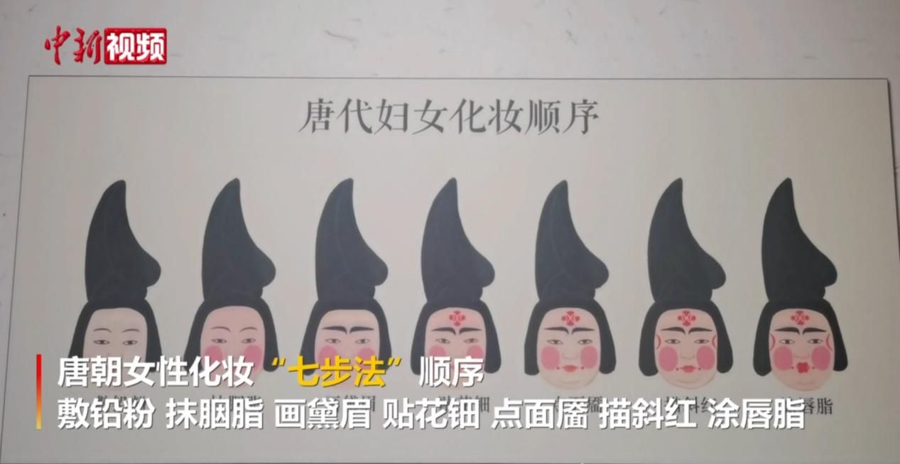 記者從展覽中的展板看到,唐朝女性化妝“七步法”順序:敷鉛粉、抹胭脂、畫黛眉、貼花鈿、點(diǎn)面靨、描斜紅、涂唇脂。