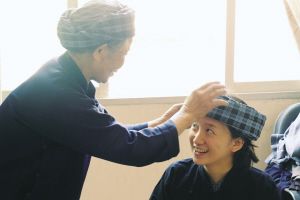 黃奶奶幫我穿戴布依族的服飾。