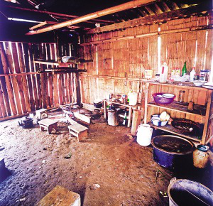 房內(nèi)一般隔成里外兩間,里間狹小,光線暗,是主人的臥室,只放雙人床和一小部分生活用品。外間寬大,是生火煮飯、聚會(huì)待客和子女就寢的地方?;鹛猎O(shè)在里間屋的門外,放鐵制三腳架,三腳架對應(yīng)的方位有固定的用途,即靠里間房門一方為主人的座位,靠外間房門一方為客人的座位,火塘上方靠墻處為子女的床位。如有成年子女和新婚夫婦,則在外間再隔出小間,里間和外間存放著生產(chǎn)用具和酒具。房內(nèi)幾乎沒有什么家具和裝飾性的陳設(shè),有的甚至沒有桌椅和床鋪,只在火塘周圍鋪著竹席或木板,合衣向火而眠?;鹛辽厦?米多高處懸掛著竹編的約1米見方的架子,上面放著食具、鹽巴、辣椒等,也是烘烤牛肉干的地方。架子上面靠房頂處并排放著幾個(gè)粗大的竹筒,里面存放糧食。這幾年的新村民居,在保持傳統(tǒng)民居特征的前提下使用了新型建材,更堅(jiān)固,更舒適。