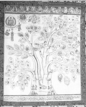 藏族“湯卡”的繪制有一個特點(diǎn),就是不注明繪制日期或繪制人的姓名(除個別的“曼湯”外),但藏族“曼湯”卻另有特點(diǎn),就是在“曼湯”的最上方留有一定位置來繪制醫(yī)學(xué)中的重要人物,特別是古代醫(yī)學(xué)家。藏族古代醫(yī)學(xué)家往往也是宗教人物。