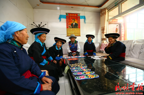 東溝村大莊村老年協(xié)會(huì)的土族老人們?cè)诮涣鞔汤C技藝 引自民族畫報(bào)
