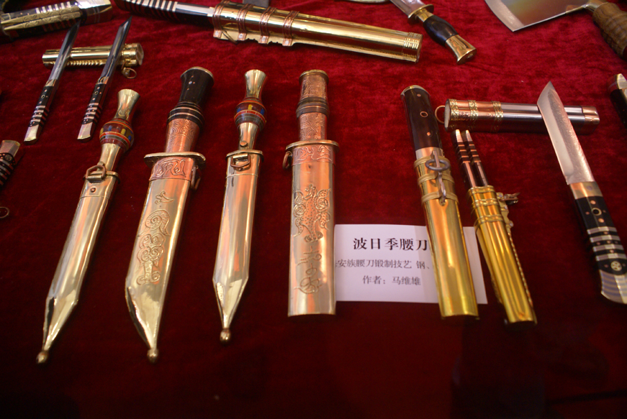 保安腰刀,是保安族的傳統(tǒng)工藝品,由于其打造技藝精悍,與新疆的英吉沙小刀、云南阿昌族的戶撒刀并稱為“中國少數(shù)民族三大名刀”,在中外都享有盛譽。保安腰刀品種繁多,有“什樣錦”、“雅五其”、“雙落”、“滿把”、“扁鞘”、“雙刀”、“細螺”、“波日季”、“哈薩刀”、“蒙古刀”等,刀面上刻 “七顆星”、“五朵梅”、“一條龍”、“一把手” 等圖案,這些圖案通常為鐵匠代號,即一看刀面團就知道是哪位鐵匠所制,而有的圖案則是記載保安鐵匠的遭遇。保安腰刀中,最為漂亮的要數(shù)“什樣錦”,“波日季”則名氣最大。