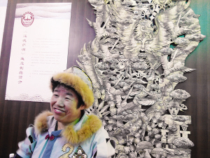 在展廳里,幾位來自黑龍江的手工藝人還現(xiàn)場展示了魚皮制作技藝。64歲的劉升從事魚皮制作已近20年,被評為黑龍江省工藝美術大師。她告訴記者,赫哲族過去主要用魚皮制作衣服,現(xiàn)在則用魚皮制作各種工藝品、小掛飾。在她身后,掛著一張長兩米多、寬約1.5米的魚皮畫《還魂薩滿》,展示了赫哲族神話傳說中的圖景,有薩滿、有森林、大鳥和各種圖騰,充滿了原始而神秘的氣息。劉升說,這還只是未完成的作品,但已用了3000多張大馬哈魚皮。