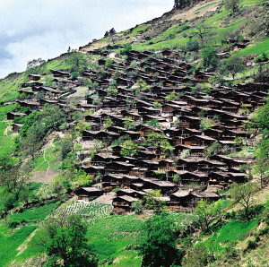 在怒江上游峽谷聚居的傈僳村寨都建在高山的半山上,其民居俗稱為“千腳落地房”。說“千腳落地”雖有些夸張,但也足以形象地說明峽谷溫?zé)岬臍夂蚝蜕礁咂露傅牡乩項l件。在雨季時,“千腳”阻力最小,使山洪順利傾瀉而下,又很快干爽,免受潮氣。而且不需挖地動土,不必移石砌墻,對木料沒有過高要求,長短皆用,在生態(tài)脆弱的高山峽谷也算環(huán)保建筑?!扒_落地”是因建房時先在確定的屋基上依斜坡程度和住房面積打進(jìn)數(shù)十根到百余根木樁為基樁,以保證居室樓板的平正?;鶚洞蚝煤?,除四面留幾根高柱作為整個房屋的立柱外,在密集木樁所形成的平面上滿鋪竹篾編織的樓板,還有竹篾圍墻,所有結(jié)構(gòu)皆用竹篾綁扎。屋頂鋪苫草或蓋木片瓦,近幾年,已陸續(xù)換上了大塊的水泥波形瓦。房門開在山墻一側(cè),有廊道,可做曬臺,平時穿的衣服都搭在這兒,也是婦女做針線活的地方。隨著怒江峽谷的開發(fā)和新農(nóng)村建設(shè)的深入,通路的村寨將很快會改變面貌。