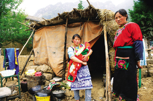 蘿卜寨的楊芝群抱著剛出生3個(gè)月的嬰兒在自建的地震棚前