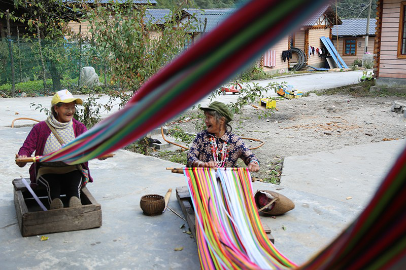 習(xí)總書記接見后,李文仕(左)回村繼續(xù)織起獨龍?zhí)?。如今獨龍?zhí)阂殉蔀楠汖埮匾膭?chuàng)收來源
