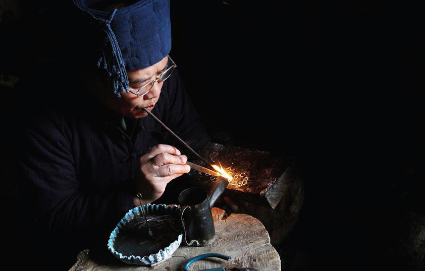 銀飾鍛制是苗族民間獨(dú)有的技藝,所有飾件都通過手工制作而成。銀飾的式樣和構(gòu)造經(jīng)過了匠師的精心設(shè)計(jì),由繪圖到雕刻、制作有30道工序,包含鑄煉、捶打、編結(jié)、焊接、洗滌等環(huán)節(jié),工藝水平極高。