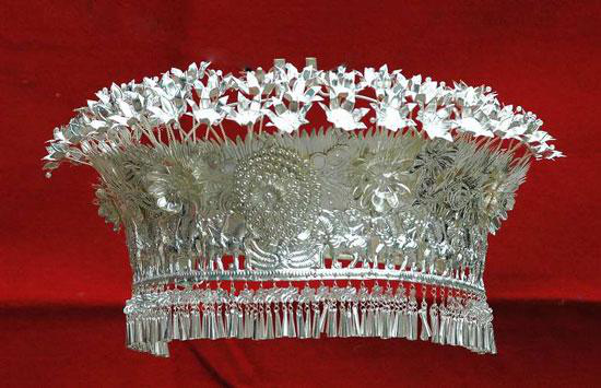 銀鳳冠和銀花帽是頭飾中的主要飾品,也是整套銀飾系列之首,素有龍頭鳳尾之美稱,其制作較為復(fù)雜,使用的小件飾品少則一百五十余件,多則達(dá)兩百余件,價(jià)值昂貴。苗族銀飾,如同苗族刺繡、織錦、蠟染等裝飾物一樣,是苗族支系相互區(qū)別的重要表征,不同地域的銀飾有著不同的特征。