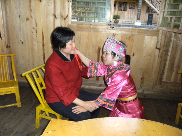 哭嫁歌內(nèi)容有“母女對哭”“嫂妹對哭”“姐妹對哭”“哭離娘席”“哭別祖宗”“哭兄弟”“哭梳頭”“罵媒人”“哭上轎”等,甚至還有同村同齡未婚姑娘的群哭——“哭十姊妹”??藜薷柙从谕良易骞媚锍黾耷暗目藜拗?,越是臨近婚期,哭聲越悲,甚至通宵達(dá)旦。2010年,“土家族哭嫁歌”已被列入第三批國家級非物質(zhì)文化遺產(chǎn)名錄。