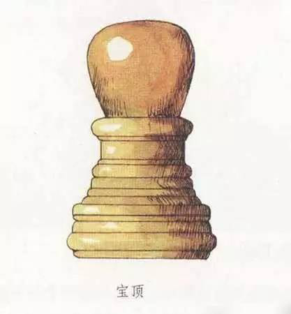 在建筑物的頂部中心位置,尤其是攢尖式屋頂?shù)捻敿馓?,往往立有一個(gè)圓形或近似圓形之類的裝飾,它被稱為寶頂。在一些等級(jí)較高的建筑中,或者確切地說,在皇家建筑中,寶頂大多為銅質(zhì)鎏金材料制成,光彩奪目。