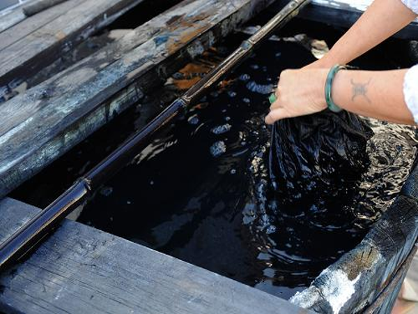 白族扎染的染料來自蒼山上生長(zhǎng)的寥藍(lán)、板藍(lán)根、艾蒿等天然植物。用得最多的是板藍(lán)根,以前用來染布的板藍(lán)根都是山上野生的,多年生草本,開粉色小花,后來用量大了,染布的人家就在山上自己種植,好的可長(zhǎng)到半人高,每年三四月間收割下來,在松木桶中漚制成染料。