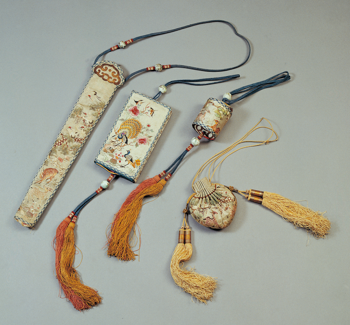 滿族服飾色彩多以淡雅的白色、藍(lán)紫色為主,紅、粉、淡黃、黑等色也是其服飾的常用色。白色在滿族服飾中是一個(gè)重要的顏色,因?yàn)?,滿族傳統(tǒng)上有尚白習(xí)俗,以白色為潔、為貴,白色象征著吉祥如意,所以,在滿族服飾中常在紅色、藍(lán)色等其他顏色的旗袍上鑲白色的花邊。滿族男女都喜愛(ài)在腰間或衣服的大襟上掛佩飾。男子有火鐮、耳勺、牙簽、眼鏡盒、扇帶。滿族女子喜歡盤(pán)頭翅,梳兩把頭或旗髻,戴耳環(huán)、手鐲、戒指、頭簪、大絨花和鬢花等各種裝飾品。擅長(zhǎng)刺繡,她們?cè)谝陆?、鞋面、香囊、荷包、枕頭等物品上刺繡花卉、芳草、鶴鹿、龍鳳等吉祥圖案(圖為滿族清代繡花湖色緞佩飾,中央民族大學(xué)民族博物館館藏)。