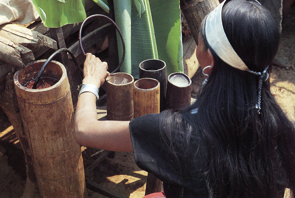 佤族普遍喜飲酒,喝苦茶。所飲用的酒都是自家釀制的“泡水酒”。常飲泡水酒不但于身體無(wú)害,反而有益健康。飲水酒成為佤族日常生活中主要的嗜好之一。喝酒時(shí)必須要請(qǐng)親友來(lái)家中共飲,主人給客人敬酒有一套規(guī)矩:必須一一敬酒。敬酒時(shí),雙手捧竹酒筒,走到客人面前,弓身把酒筒從自己胸前按下再向上舉到客人嘴邊,主人喝一口,最后敬給客人喝干。如此一一敬酒,直至敬完所有在場(chǎng)的人,漏敬一個(gè),都會(huì)被認(rèn)為是不合“阿佤理”的。敬酒時(shí),第一個(gè)被敬酒的人,通常是在場(chǎng)的客人中最被尊重的人。他接過(guò)酒后,先要用右手沾出幾滴,滴在地上,并口念祝福的語(yǔ)言,表示敬主人的祖先(圖為用竹筒制水酒,劉軍攝)。