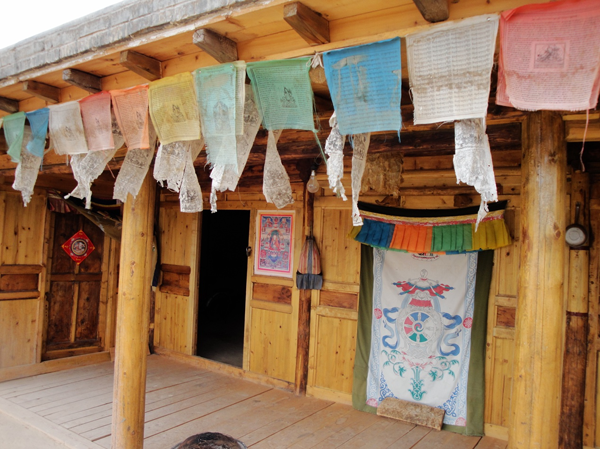為改善狹小的寨內(nèi)空間,當(dāng)?shù)鼐用窬藿硕幽窘Y(jié)構(gòu)樓房,和青海鄉(xiāng)村民居庭院寬敞的特點(diǎn)形成了反差。寨內(nèi)民居庭院多為四合院式,房屋為土木結(jié)構(gòu)平頂房,一般民居都有飛椽花藻之類。屋內(nèi)一般以木板作隔扇,室內(nèi)有護(hù)炕木板、護(hù)墻木板墻圍,且多雕花草于其上。房屋一般面闊三間,正面以木板隔墻并裝上木板條方格小花窗。佛堂設(shè)在二樓,佛堂所在的房屋一般都是上房,和佛堂不同向的兩邊廂房一般做臥室。院落中央一般都有豎掛經(jīng)幡的旗桿,還設(shè)有桑臺(tái),具有明顯的藏式特點(diǎn)。