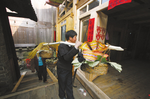 新娘離開娘家時,女方不僅要送單數(shù)的雞、鴨,如5、7、9只,就連給男方所挑的陪嫁品擔(dān)子也必須是單數(shù)的。