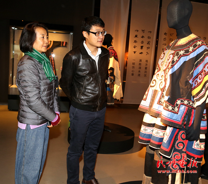 中國(guó)民族博物館館長(zhǎng)顧群(左三)、中國(guó)婦女兒童博物館副館長(zhǎng)劉華彬(右三)、中國(guó)民族博物館副館長(zhǎng)張志文(左二)、中國(guó)民族博物館副館長(zhǎng)鄭茜(右一)等嘉賓參觀展覽