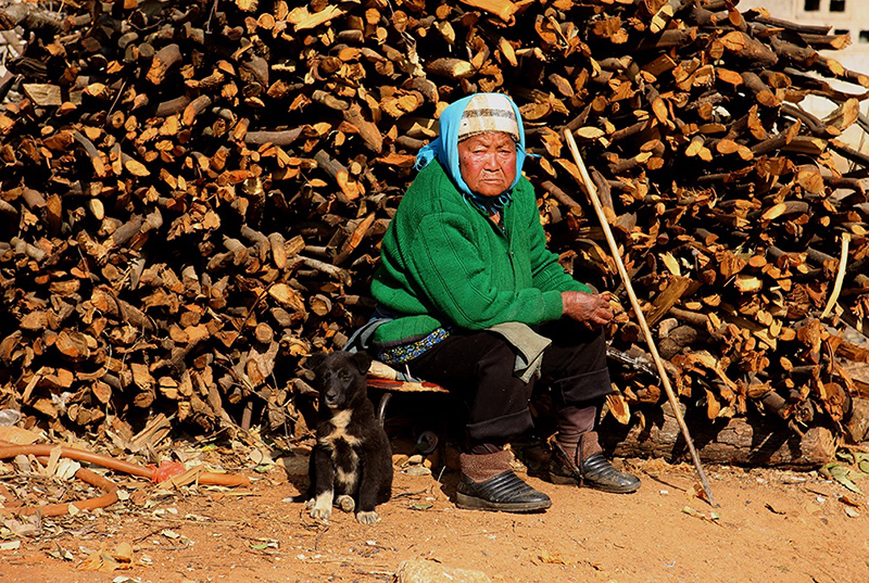 2月初的丘北,連日陰雨,是一年中最冷的時節(jié)。我先于拍攝團(tuán)隊幾天到了村里,想獨(dú)自在這里轉(zhuǎn)轉(zhuǎn),熟悉一下村民,篩選一下拍攝的人物。正當(dāng)我在一個泥濘的岔路口徘徊,尋思著是否要問路去村主任家的時候,旁邊屋子里走出一個人,面容親善:“天好冷啊,進(jìn)來烤烤火吧!”他打招呼的方式如同熟人,一笑時露出兩排又白又整齊的牙齒。于是,他家擁擠的火塘邊又多了一個人。大家圍著火爐有一搭沒一搭地聊天,語調(diào)溫和小聲,沒話的時候大家也不覺得別扭,只聽見玉米骨在火塘里噼啪作響。這是一個五代同堂的大家庭,招呼我的主人楊樹紅和妻子以及祖母、父母一起生活,兒子和女兒在廣東打工,已經(jīng)回村準(zhǔn)備過節(jié),兒子未婚,女兒則有了兩歲的孩子。楊樹紅的祖母出生于1922年,是這個村子里最老的老人,耳朵有些背。我大聲問她是否還記得年輕時候踩花山,她拍著我的手背說:“17歲我就去踩花山嘎!好玩嘎!”兒媳笑著解釋說:“估計她說的是17歲踩花山的時候碰到爺爺,被他拖媳婦拖走的事呢?!弊婺改昙o(jì)太大,看著她手上和臉上深深的褶皺,不知藏了多少往事。