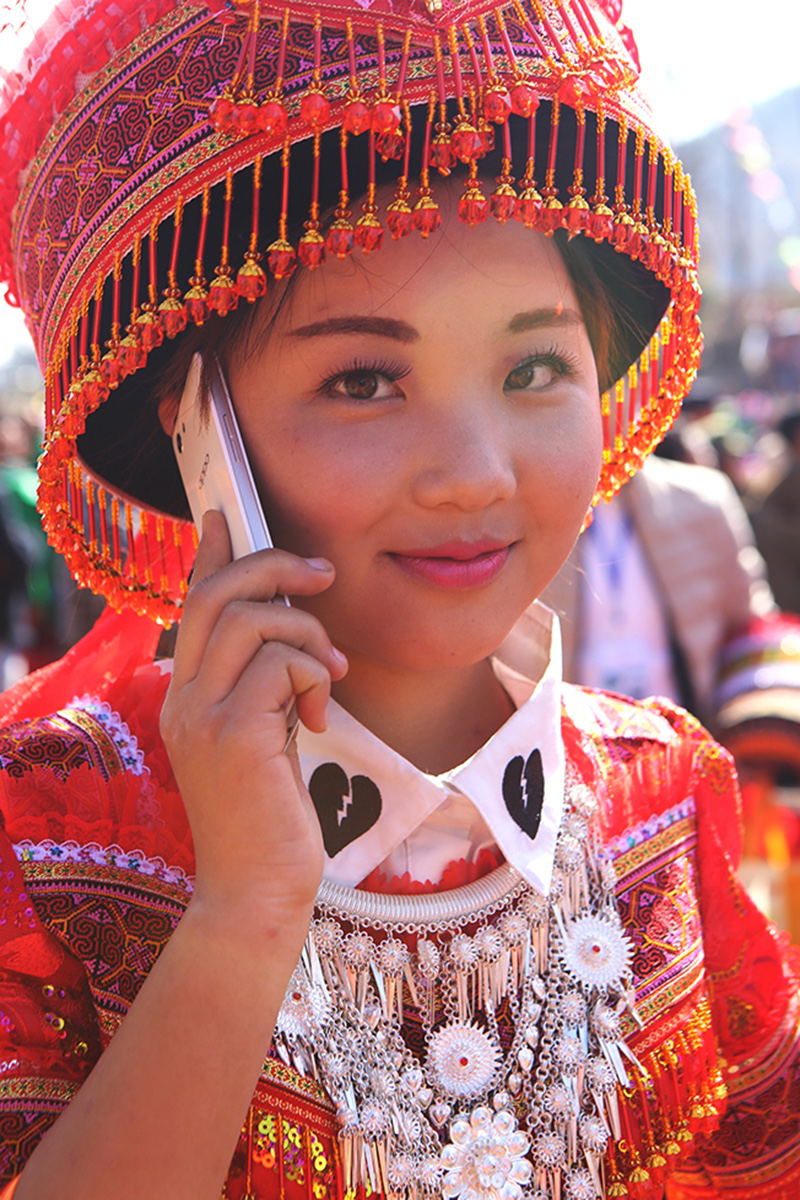 由于在歷史上經(jīng)歷長時間、大范圍的遷徙,苗族文化形成了較強(qiáng)的環(huán)境適應(yīng)能力和流動變遷特征。節(jié)日作為民族文化的凝集點(diǎn),慶祝方式和形態(tài)也處于動態(tài)的演變和傳承之中。在大布紅的花山場,一個從老撾過來的苗族女子樂隊讓當(dāng)?shù)氐拿缱迦烁械胶闷妗f著同樣的西部苗語,卻穿著略顯不同的衣服。她們排成一行,教人們一來一往地扔繡包,一時間圍觀者無數(shù)。不消多久,女子樂隊手中的CD就在人群中銷售一空。