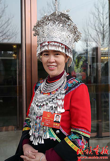 “頭頂高高的銀飾,脖子上一圈圈精美的項(xiàng)圈,走起路來叮當(dāng)作響,來自重慶市彭水苗族土家族自治縣的全國人大代表李紹玉(苗族)的這一身穿戴,一出現(xiàn)就很抓人眼球。再細(xì)看,這一身大紅的苗族傳統(tǒng)衣裝上,胸前、袖口還有繁復(fù)精致的刺繡。