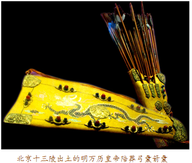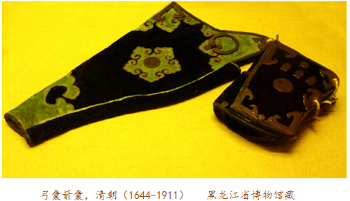 當(dāng)弓囊出現(xiàn)在眼前時(shí),我們應(yīng)當(dāng)想到它的另一半——箭囊。實(shí)事上,古代盛裝弓箭的器物被稱為櫜鞬(gāo jiàn),櫜盛箭,鞬裝弓,多以皮革制作。比如明十三陵出土的萬歷皇帝陪葬品櫜鞬,就用皮革縫制,外敷黃色素緞,金繡龍紋,鑲嵌金飾件及各色寶石。一般來說,弓囊為上寬下窄的袋形,箭囊則為長方形。在蒙古語中,弓囊與箭囊合稱為“撒答”。因?yàn)椤按稹迸c“袋”讀音相近,所以元代的漢族作家便在作品中將之寫為“撒袋”。這樣,“撒袋”一詞便入了漢語詞匯,特指裝弓盛箭的袋子。