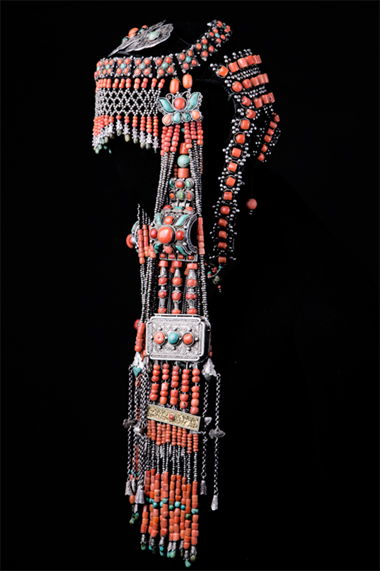 髻側(cè)流蘇飾:系于鬢角兩側(cè),其上部銀飾造型從整體上看似飛翔狀蝴蝶,鑲嵌精美紅珊瑚珠、綠松石,造型熱情似火。蝴蝶銀飾之下垂系五條流蘇, 由紅珊瑚珠、綠松石珠及銀珠串間隔穿成五段,下墜蝴蝶型銀飾帽, 內(nèi)銜桃形瑪瑙墜,流蘇在鬢角兩側(cè)隨頭的轉(zhuǎn)動而飄擺, 響聲清脆。
