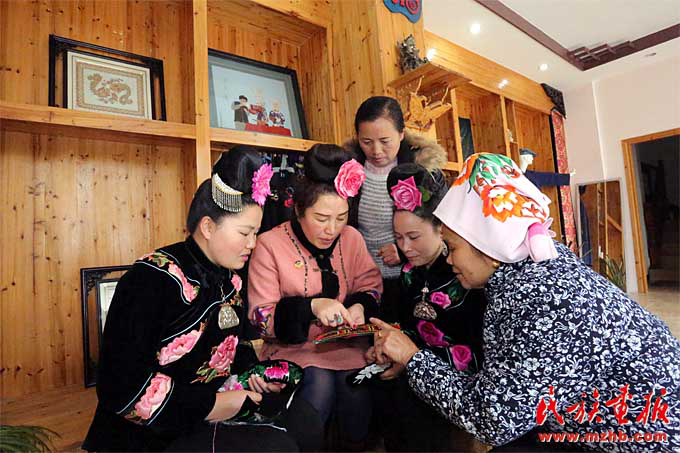長(zhǎng)裙苗刺繡國(guó)家級(jí)傳承人楊阿妮(左二)和繡娘們交流刺繡技法