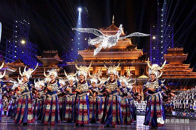 2018年中央電視臺(tái)春節(jié)聯(lián)歡晚會(huì)上黔東南分會(huì)場(chǎng)的歌舞表演(黔東南微報(bào))