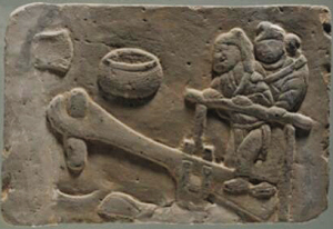 長31厘米,寬19厘米,厚5厘米,呈長方形。生動刻畫了一個推磨的場景。磨的一端為一婦女,一端為一小男孩。婦女頭梳圓形發(fā)髻,身著長裙、短上衣系長帶,雙手握推杠于胸前,眼睛注視著推杠另一端身高不及杠的小孩。小孩全身裸露,背朝外,頭向上昂起,看著高過頭頂許多的推杠,雙手作吃力地推杠狀。整個畫面將母子二人推磨時(shí),母親憐愛孩子的情景淋漓盡致地表現(xiàn)出來。