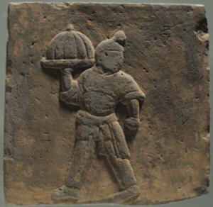 邊長30.5厘米,厚5厘米,呈方形。畫面中央為一人用手托舉鳥籠圖。人物以浮雕的方法突出總體輪廓,衣飾細(xì)部花紋則用線刻,腿部和臂部的肌肉繃起,形成了合理的藝術(shù)夸張。