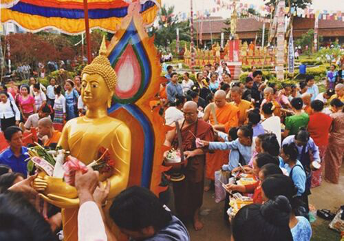 新年潑水是一種禮節(jié),既隆重又熱鬧。除夕那天,人們先到佛寺里,取來(lái)最干凈的清泉(江河)水,采來(lái)最香的鮮花,把花瓣撒在水中,每人取一瓢,用含著花香的清水給佛像沐?。ㄏ笳鹘o佛祖沐?。砬髞?lái)年平安。儀式舉行完后,人們用樹(shù)枝和鮮花浸水相互淋灑,以示祝福,口中不斷地說(shuō)著“薩瓦沙麗”(吉祥安康)“如利京宛”(幸福健康)。對(duì)長(zhǎng)者只能輕輕地淋灑在肩和背上,表示尊重。到佛寺外和街上,年輕人們就可以潑水狂歡,以示祝福和歡樂(lè)。