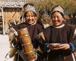 在工布地區(qū),不管是遠(yuǎn)方的來客,還是常來常往的朋友,一踏進(jìn)主人的新家,主人首先端出的是香噴噴的酥油茶。如果是尊貴的客人,還要被請到上座。招待來客時,主人會敬上酥油茶和青稞酒,尤其是青稞酒,主人要兩手棒著,恭敬地送到客人手上,客人喝一口,主人添一次,連續(xù)三次??腿俗詈笠豢跉獍驯械木坪韧?,這就是通常所說的三口一杯。如果客人推辭,主人還要獻(xiàn)上優(yōu)美動聽的酒歌,以此來表達(dá)主人的熱情和對客人的尊敬,直到客人把杯中的酒喝完為上。手捧酒杯,主人依次要給所有的來客敬上一遍。杯杯醇酒,盛滿了工布人的情和意。那情景,常令在場的人感動不已。