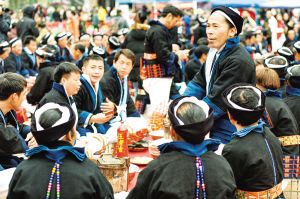 每逢重要節(jié)日,白褲瑤群眾都有舉辦長席宴的習俗。以前,芭蕉葉當作盤子,芭芒干折成筷子,一個飯團、一塊牛肉,再加一碗酒,就是長席宴的全部?,F(xiàn)在改變了很多,但不變的是白褲瑤自然、和諧、平等的美德。2019年2月拍攝。