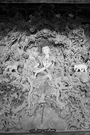 摩尼殿內(nèi)槽北壁是一座泥塑五彩懸山,上有塑像數(shù)十尊,正中為五彩觀音菩薩像,俗稱“倒坐觀音”。倒坐是指觀音菩薩不坐在大殿的正中央,而在后壁倒坐。觀音像衣袂飄飄、彩妝絢麗,面容秀麗恬靜,是古代彩塑中不可多得的藝術(shù)珍品。整個(gè)大殿的平面呈十字形,有16個(gè)凸轉(zhuǎn)角和8個(gè)凹轉(zhuǎn)角,形制特別。梁思成曾贊譽(yù):“這種的布局,我們平時(shí)除去北平故宮紫禁城角樓外,只有在宋畫里見過,那種畫意的瀟灑,古今的莊嚴(yán),的確令人起一種不可言喻的感覺?!?/p>