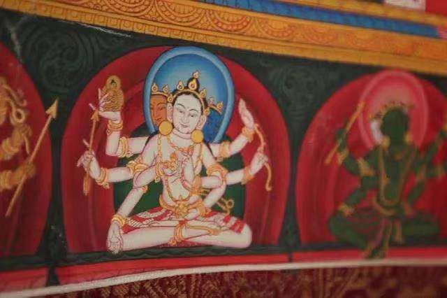 900多年前流傳于衛(wèi)藏地區(qū)(現(xiàn)山南)的齊烏崗派唐卡,由雅堆·齊烏崗巴創(chuàng)立,與嘎瑪嘎赤畫派、勉塘畫派、欽孜畫派、埃赤畫派并稱“唐卡五大畫派”。齊烏崗派特點為人物體形飽滿、生動細(xì)膩,色彩以棗紅、橘紅暖色系為主;中央的主尊突出,背景多用卷草紋作為裝飾。特別是,齊烏崗派唐卡的佛像肩膀旁都有象征翅膀的“三角”,源于創(chuàng)始人齊烏崗巴行動靈敏,亦被稱作“齊烏派”。