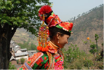 云南巍山彝族回族自治縣各民族如壯麗的織錦,將生活裝扮得五彩繽紛,充滿詩(shī)情畫意。其中特別是東山一帶的彝族服飾色彩較為豐富,款式變化多姿,并且以大量的銀制品和刺繡裝飾,制作工藝之精良,堪稱少數(shù)民族服飾一絕。以小孩帽而言,就有魚尾帽、小瓢帽、銀鼓帽、花帽和搭耳帽等數(shù)十種,名目繁多,式樣各異。帽子上都繡有花草、樹葉、龍鳳圖案,鑲嵌著閃亮的銀首飾,十分逗人喜愛。小孩的衣服式樣也很多,大多由紅、藍(lán)、綠、白幾種顏色的布料縫制而成,紅綠交織,藍(lán)白相襯,非常艷麗。如花朵一般的彝族少女通常頭戴銀鼓帽,墜耳環(huán)、身穿藍(lán)領(lǐng)褂,腰系花圍裙,下著綠彩褲,背掛圓裹背。銀鼓帽和繡花鞋做工極為精巧,全套裝飾花團(tuán)錦簇,恰似一只開屏的孔雀。結(jié)婚后的婦女就不再戴帽子,改為結(jié)發(fā)髻,裹包頭。發(fā)髻一般呈寶塔狀,外裹黑紗和黑布包頭,發(fā)髻上戴“別子”。“別子”其實(shí)就是發(fā)卡,均為銀制品,分為四串,每串有兩個(gè)燈籠繡球,兩個(gè)響鈴和兩尾小魚。包頭巾外再用銀串珠、亮球飾之。上衣著右衽大襟,前短后長(zhǎng)、領(lǐng)、袖及襟邊則鑲以多層不同的金銀絲瓣或自繡花紋的多層寬窄不同的花邊。外罩齊腰藍(lán)布短領(lǐng)褂,領(lǐng)口上安裝著七個(gè)用銀鼓釘湊成五個(gè)葉子,狀如葵花形,彝語(yǔ)叫“披巴”的裝飾。領(lǐng)褂四周皆用銀鼓釘鑲邊,共四排,每排36顆。一件領(lǐng)褂上需有兩百多顆銀鼓釘,加上胸前佩戴銀制的“三須”針筒,“菱角吊”串珠和雞心型繡花荷包,整個(gè)裝飾真是銀裝素裹,分外嬌嬈。腰間系的圍腰布上,鑲嵌多層金銀絲瓣或自繡圖案的花邊。圖案有串枝蓮、牡丹花、太陽(yáng)花及鳳戲牡丹、丹鳳朝陽(yáng)等。無論未婚和已婚婦女,背上都有一個(gè)用羊毛搟制而成的圓型繡花裹背,直徑約一尺不等,內(nèi)外兩層,中可承物,上繡兩對(duì)太陽(yáng)花,一大一小,對(duì)稱排列。裹背除用作裝飾外,還可保護(hù)腰部,既有欣賞價(jià)值,又有實(shí)用價(jià)值,這在巍山彝族服飾中是最為典型的一件飾物。銀鼓帽繡有42朵小花,鑲有96顆銀鼓釘,帽頂插有花一朵或釘有櫻花一束。其帽形如金魚,魚頭魚身為帽,魚尾多岔分為護(hù)頸,亦稱為“魚尾帽”。繡花鞋呈船形或鳳頭形,鞋面繡有40余朵小花,紅色中夾有40余片綠葉。如果是新娘鞋,則用紅色或粉色的軟鍛做鞋面,更為講究。