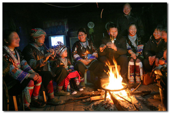 苗族起木樓很注重火塘的設(shè)置,特別留出二樓正中的大半廂作火塘。火塘用寬厚老杉木板鑲制成一個(gè)長(zhǎng)寬約一點(diǎn)五米,深約六十公分的正方形木槽,槽內(nèi)用粘性強(qiáng)的黃泥巴填滿舂緊,正中央安放有三腳鐵架,用于架鍋煮食?;鹛潦侵笫场⑦M(jìn)餐、取暖、會(huì)客、議事、祭祀的地方,又是年輕人走妹行歌、談情說(shuō)愛(ài)、舉行婚禮儀式的場(chǎng)所。因此苗家人對(duì)火塘是十分看重的。
