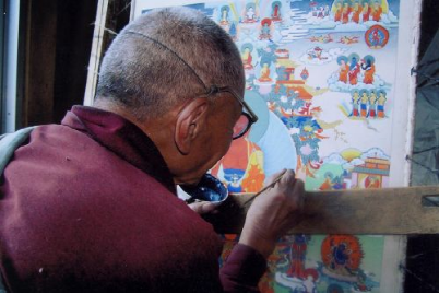 嘎瑪噶赤畫派,屬西藏東部地區(qū)畫派。相傳由郎卡扎西所創(chuàng),與其同時期的八世噶瑪巴米久多吉,奠定了嘎瑪噶赤畫派的理論基礎。十六世紀,嘎瑪噶赤畫派開始盛行康區(qū),先后涌現(xiàn)出了一批大師。嘎瑪噶赤畫派在發(fā)展過程中,由于生存地域與漢地緊密相連,在政治、經(jīng)濟、文化上的交往也相對頻繁,尤其在繪畫方面,多受漢地明代以后工筆重彩畫和四川綿竹木版年畫的影響。嘎瑪噶赤畫派在嚴格繼承傳統(tǒng)繪畫的基礎上大膽創(chuàng)新,吸收漢族畫家工筆重彩之精華,注重抒情寫意之風格;講究色彩對比,結(jié)構(gòu)嚴謹,畫工細膩,最后達到精美絕倫之境界。其總體風格形成了有別于衛(wèi)藏地區(qū)門唐、欽澤兩大畫派的特征。二十世紀初,噶瑪噶赤畫派藝術更為完善和成熟。
