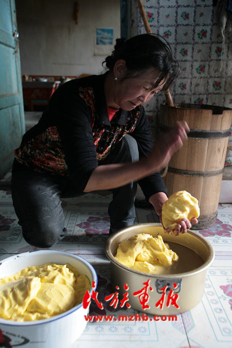 經(jīng)過反復(fù)搗動、分離而制成酥油,并將其保存在牦牛胃制成的口袋里