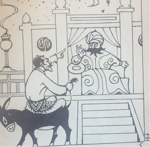 阿凡提一手舉起毛驢的尾巴,一手指著國王的下巴,說道:“您的胡須恰好同我的毛驢尾巴上的毛一樣多呀!”