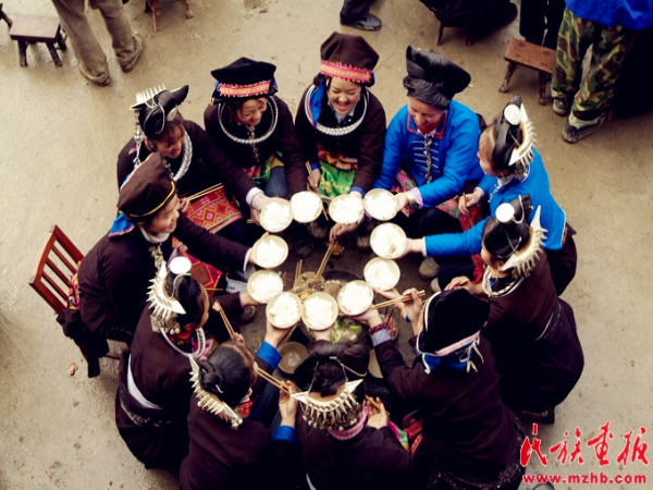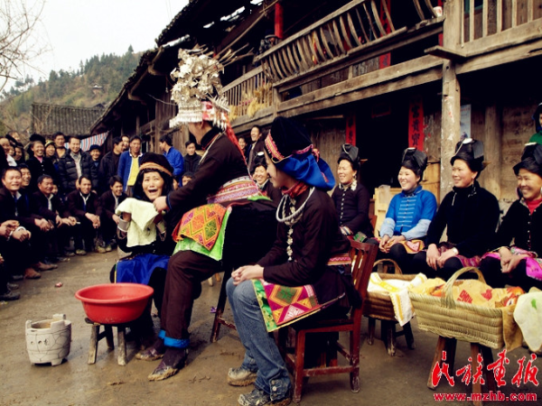 敬酒過(guò)后,新娘走上吊腳樓進(jìn)入洞房休息片刻,然后與新郎一同在樓上向前來(lái)賀喜的親友拋灑喜糖。來(lái)賓蜂擁而上爭(zhēng)搶喜糖,一片歡騰場(chǎng)面。分完喜糖,新娘來(lái)到吊腳樓前的院子里用早已準(zhǔn)備好的清水親手為婆婆擦臉,表示新媳婦對(duì)長(zhǎng)輩的尊敬與孝心。