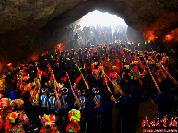 苗族同胞們身著節(jié)日盛裝,在溶洞里舉行“跳洞”,祭祀先祖,祈禱來(lái)年風(fēng)調(diào)雨順