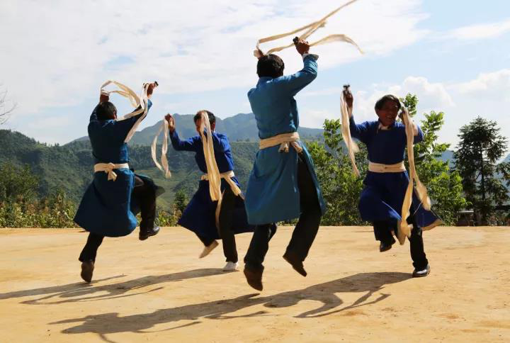 “鈴鐺舞”主要流傳在烏蒙山區(qū)的彝族聚居區(qū)。彝語稱“懇合唄”?!皯┖稀?,指祭祀禮儀中唱經(jīng)文的歌,“唄”即跳的意思,又稱“跳腳”、“抄子舞”。合起來就是通過舞蹈表演的形式加上歌師的訴唱來祭奠死者的意思,是彝族先民在祭祀教化活動時按倫理輩分和長次舉行高歌創(chuàng)業(yè)公德的騎馬戰(zhàn)狀舞蹈。