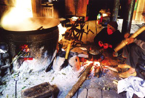 二層為生活起居場(chǎng)所。壯家人的火塘,是一家人炊煮就餐、烤火取暖之處。現(xiàn)在即使用上了沼氣和電器的家庭也離不開火塘