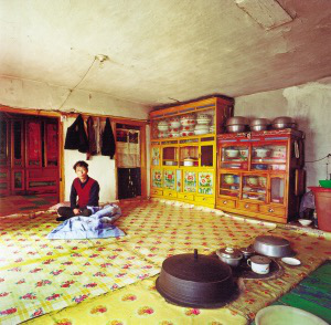 朝鮮族傳統(tǒng)住房不論什么結(jié)構(gòu),都是滿屋炕。進屋脫鞋,席炕而坐是他們的習慣。房門的門檻很高,進門是一塊一二平方米大小的屋地,接著是凹下去1米左右的燒火坑,里面是灶膛,放燒柴,平時蓋著木板,或添足燒柴坐在上面炊事。這樣,蓋板、灶臺、炕面在同一平面,像延伸了的火炕,既干凈又防火。因房屋較矮,又有大面積的火炕,加上明亮的玻璃窗,在