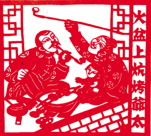 滿族風(fēng)情剪紙《火盆上炕烤爺太》