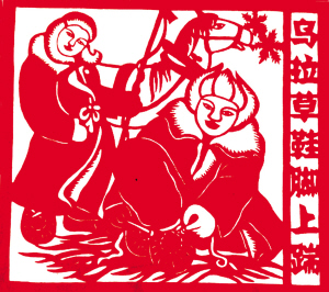 滿族風(fēng)情剪紙《冰上釣魚單線拽》