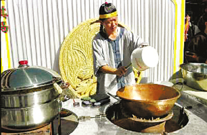 在沈陽清文化國(guó)際旅游節(jié)上,廚師現(xiàn)場(chǎng)制作薩其馬